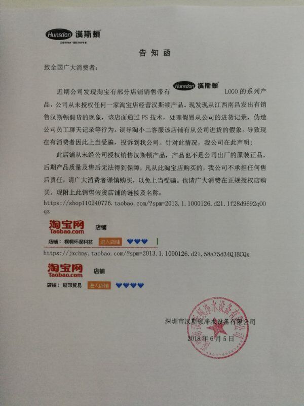 漢斯頓凈水品牌重要告知函,請網購客戶認真閱讀!網店假貨查處通知,擦亮雙眼,別貪圖便宜!