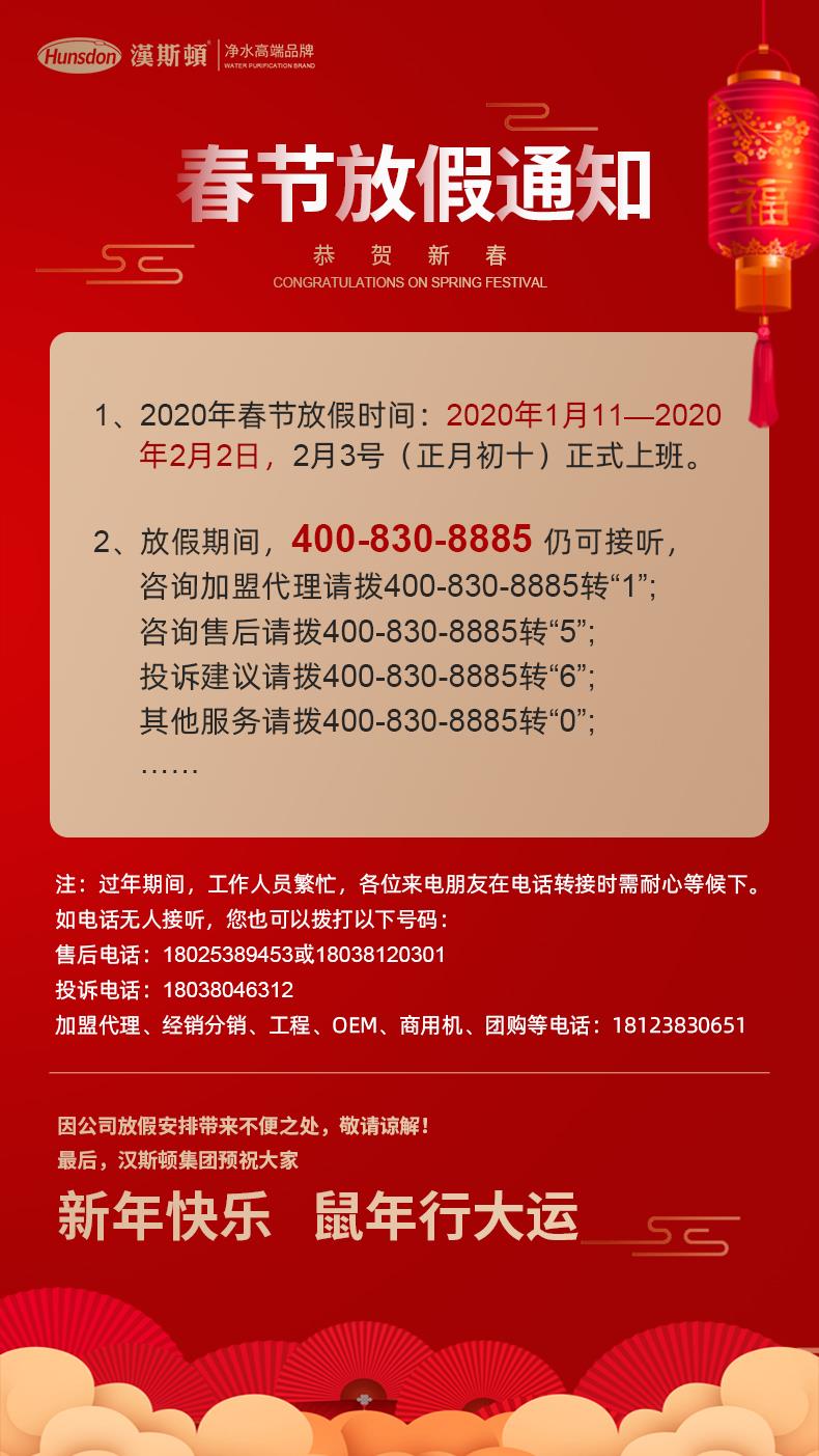 服務通知:關于漢斯頓2020春節假期服務安排2020-01-09   來源:本站   作者:管理員   人氣:58次