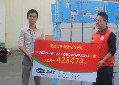 2013年4月,在四川省雅安市蘆山縣發(fā)生地震,漢斯頓作為深圳首批捐贈企業(yè)迅速做出反應,第一時間出去漢斯頓公益團隊30余人,帶上捐贈物質,設備及食品,前往災區(qū)一線,進行救援活動。對于災區(qū)首期重建工作,漢斯頓將捐贈價值100萬的凈水設備,來保障災區(qū)人民的飲水安全。