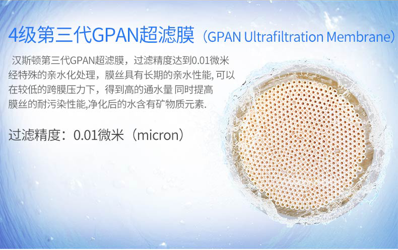 其中GPAN超濾膜,采用內壁鏡面光滑技術,具有易于沖洗,防止二次污染;有更好的親水性、通透性好、彈性好,可以承受水壓達到12公斤,而普通的凈水材料僅有8公斤的承壓;不會出現短絲等現象;材料具有殺菌抑菌的功能;使用壽命比普通超濾膜壽命更長等特點。