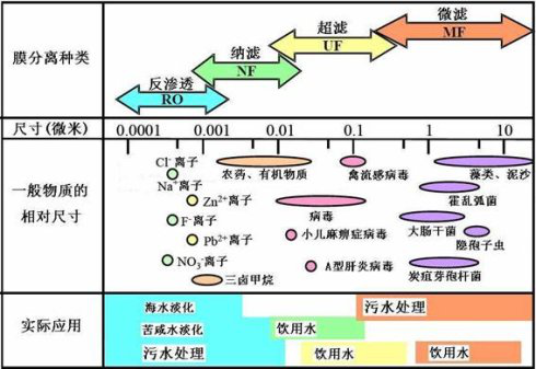 濾芯是一個凈水器是否能有效去除水中雜質的關鍵,不同種類的濾芯會將不同大小的微粒物質從水中除去,最終決定產品水的水質。濾芯按孔徑大小分為微濾、超濾、納濾(現在一般不怎么提倡)、反滲透。如圖:
