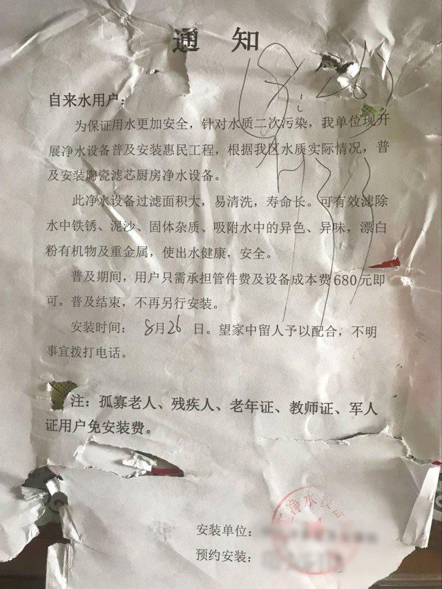 李女士說(shuō),今年的8月26號(hào)早上,她發(fā)現(xiàn)家門口多了一張通知。上面寫道:開展凈水設(shè)備普及安裝惠民工程,普及安全凈水設(shè)備。沒過(guò)多久,便有一個(gè)自稱是某凈水設(shè)備安裝處的工作人員上了門。