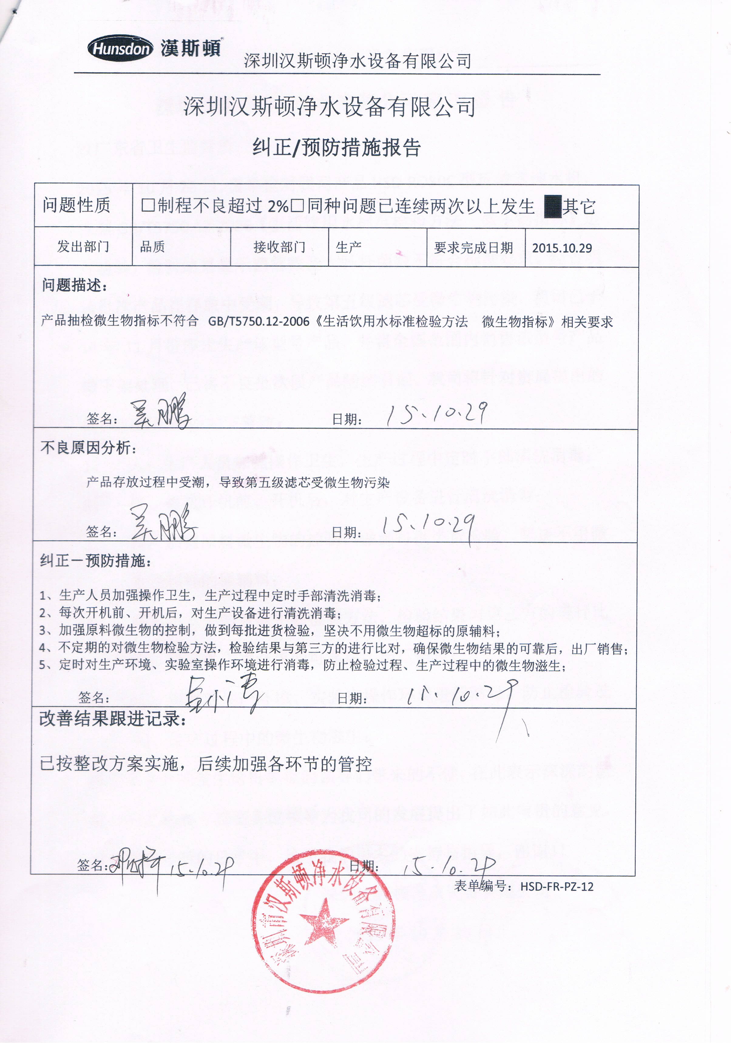 為了保證消費權益,打造更好的企業形象,漢斯頓近日對公司產品進行大規模檢測,杜絕不良產品流向市場中去。目前公司對所有的產品都進行了抽樣檢測,其中發現HSD—RO50C型反滲透純水機因為存儲不良的問題,導致大批產品受潮,從而使其五級濾芯受微生物的污染。檢測過程中發現,受潮的凈水器產品過濾的水質,不符合飲用安全標準的需求。依據GB/T5750.12-2006《生活飲用水標準檢驗方法 微生物指標》進行檢測,檢測結果顯示菌落數及大腸桿菌數不符合要求。目前漢斯頓總部已經立即采取措施,停止HSD—RO50C型反滲透純水機的生產,將全國范圍內銷售該型號產品做下架處理,并將不良批次段產品陸續召回。漢斯頓始終堅持以產品質量為核心的宗旨,堅決杜絕不良產品的出現,保證消費者的權益。