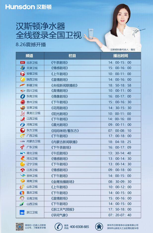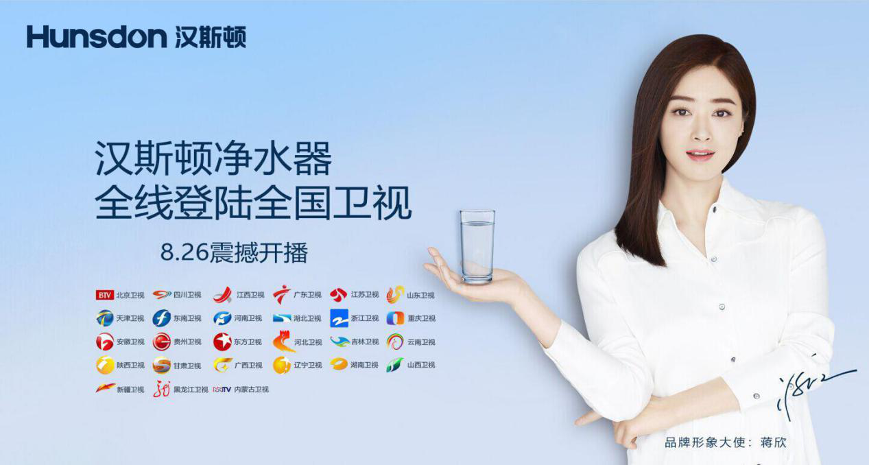 8月26日,「漢斯頓 」戰略布局的第二槍開啟了。漢斯頓凈水品牌廣告片在北京、浙江、廣東、江蘇等27省王牌衛視臺強勢播出,開啟霸屏模式。