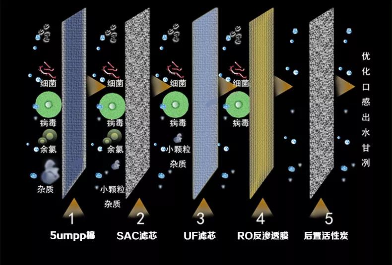 A4:凈水產(chǎn)品就是將自來(lái)水經(jīng)過(guò)PP濾芯,去除水中較粗的固體物質(zhì);再經(jīng)過(guò)顆?;钚蕴繛V芯,吸附水中的余氯、異味、異色、固體雜質(zhì)及其它有害物質(zhì);然后經(jīng)過(guò)超濾膜進(jìn)一步過(guò)濾水中膠體、部分有機(jī)物、細(xì)菌等,得到用于洗菜洗碗的生活用水;RO反滲透膜再次深度過(guò)濾,去除水中細(xì)菌、病菌、重金屬、化合物等有害雜質(zhì);后置活性炭濾芯,去除異味,改善口感,得到可直接飲用的純水。
