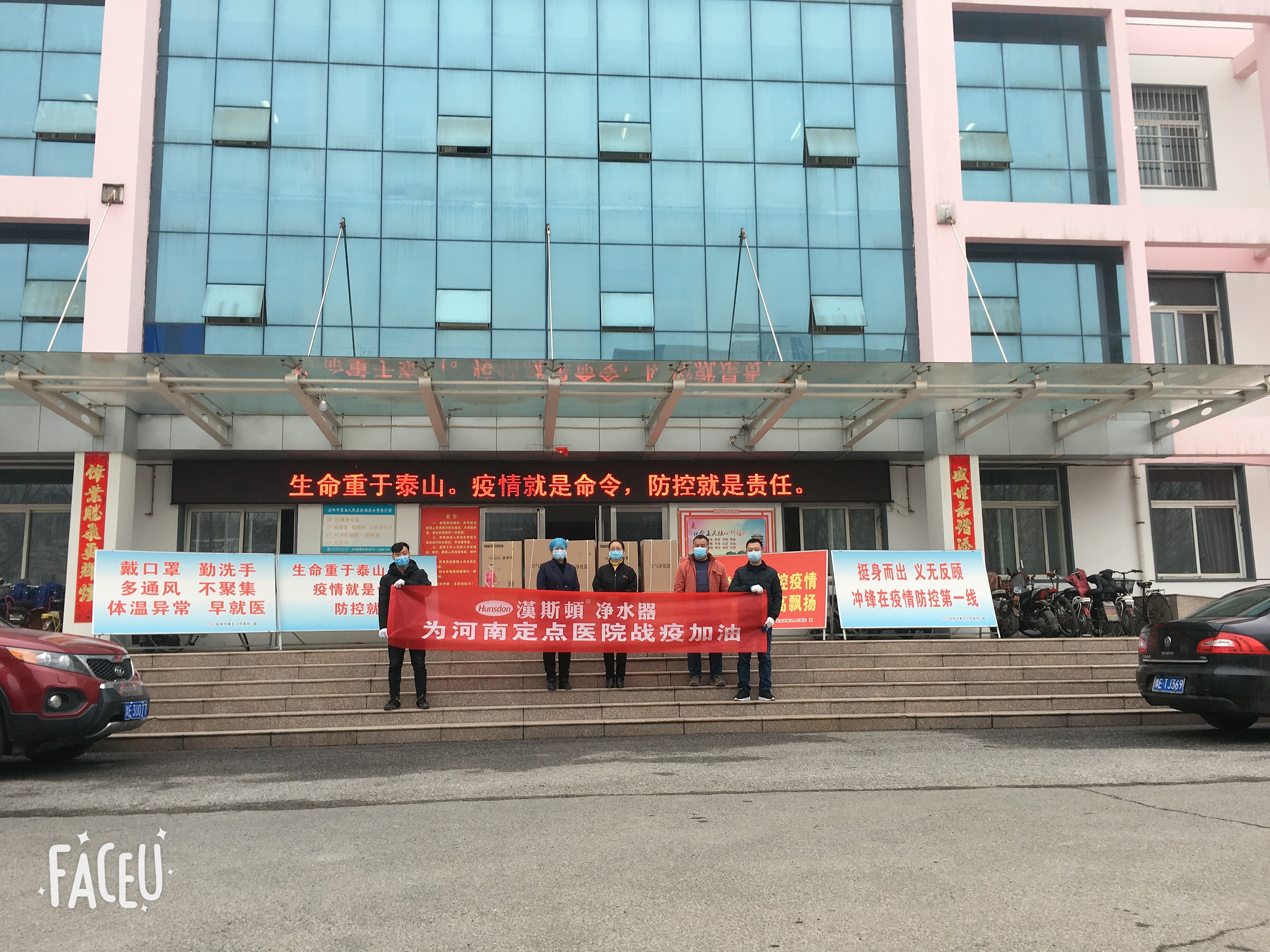 2020年3月11日,為應對一線定點醫院抗疫防控需求,切實關注醫護人員健康防護安全,漢斯頓集團向南陽醫專第一附屬醫院捐贈商用飲水臺、凈水器和多用途空氣凈化器等產品,為奮戰在抗“疫”一線的醫護人員提供多方位的防護保障。