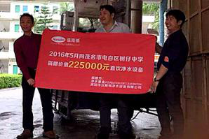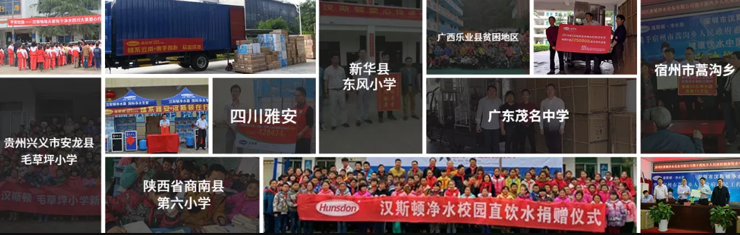 2016年6月,漢斯頓凈水器和美國基金會,聯合發起的“以愛凈水”公益項目,向茂名市電白區樹仔中學捐贈價格22.5萬元的全套凈水設備正式使用。該活動得到了政府、學校領導、學生的支持和贊揚,在當地引起不小的反響。