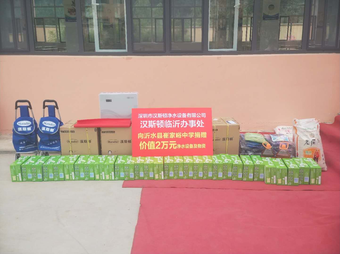 愛是陪伴,細水長流。漢斯頓工作人員,再次走進校園,把愛心送給莘莘學(xué)子和在講臺上無私奉獻的老師們。漢斯頓臨沂辦事處向沂水縣崔家峪中學(xué)捐贈價值20000元的凈水設(shè)備和物資及30箱牛奶。