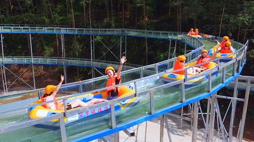 整個漂流河道分為兩段,空中玻璃漂流+天然峽谷河道,兩段河道首尾無縫相接。賽道地勢險峻,懸壁陡直,中間裂縫橫穿,沿途毓秀鐘林,奇石琳瑯,刺激與精彩結合,體驗高空呼嘯滑過的同時又飛舟激流沖浪的感覺。