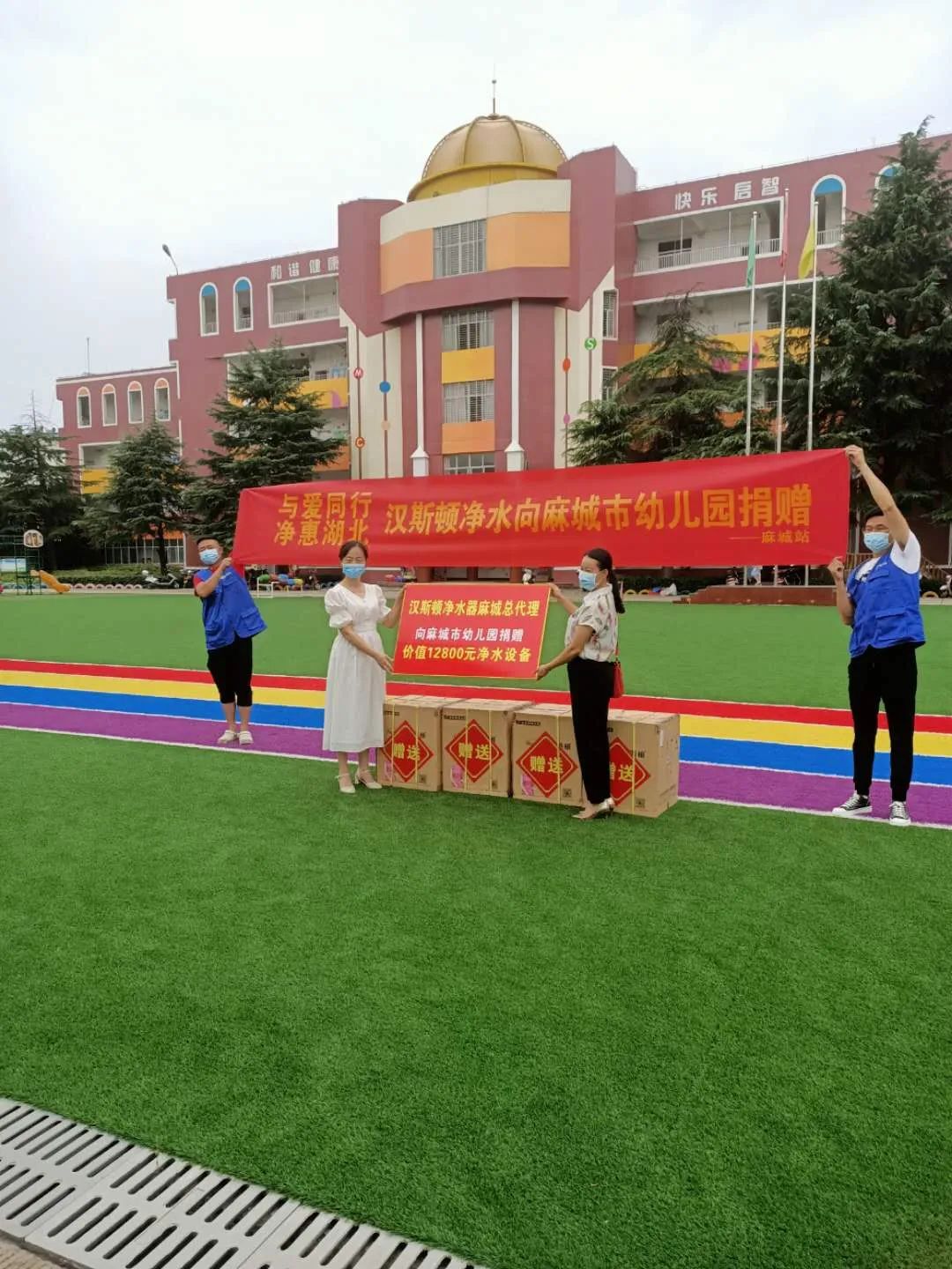 “與愛同行,凈惠湖北”。2020年8月25日,在漢斯頓黨支部的領導下,漢斯頓駐麻城總代理開展愛心公益活動,為麻城市幼兒園捐贈一批凈水設備,為該校幼兒的飲水健康提供了重要保障。